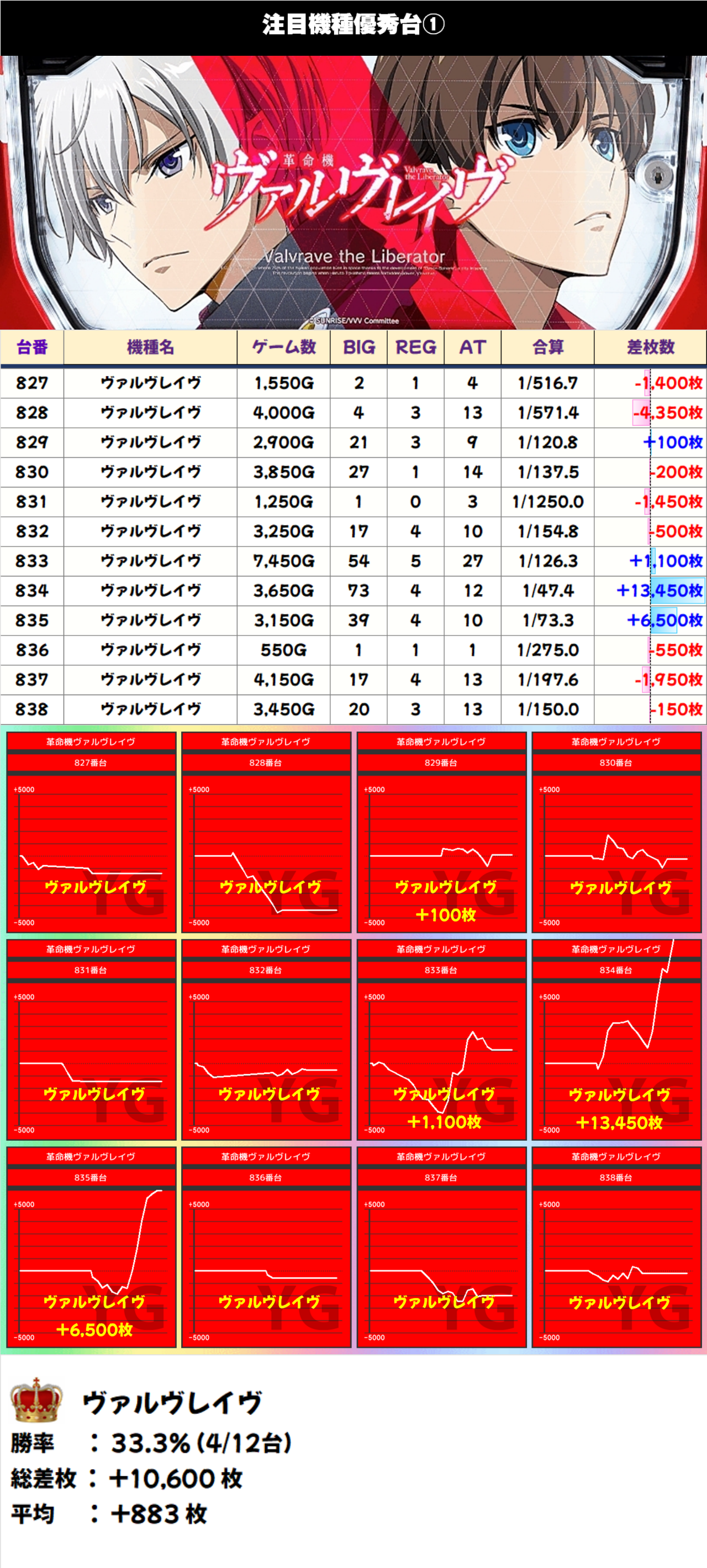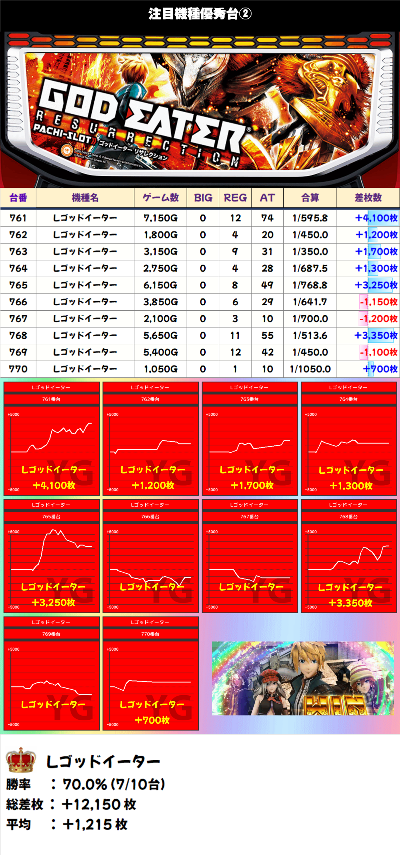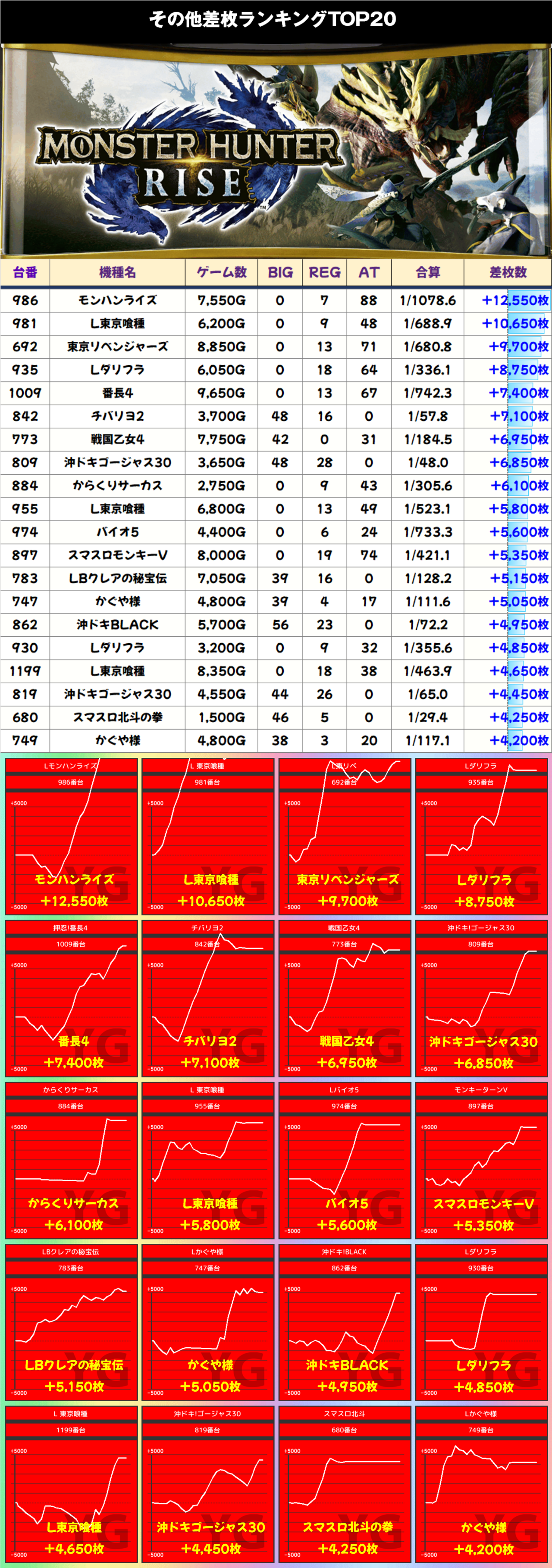 それ以外の機種差枚ランキングをみてみると、トップは【モンハンライズ4・986番台】の+12550枚を筆頭に、【L東京種喰・981番台】の+10650枚が続いた。