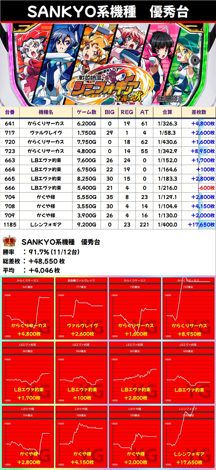 今回の「神奈川キコーナ17店舗一斉オープン」は9/20の土曜日に開催!この日もお馴染みのSANKYO系機種から優秀台をしっかりと確認!ピックアップした12台は全台ほぼプラス&打ち込みもバッチリと、質の高い優秀台でバッチリ好結果となっていました!