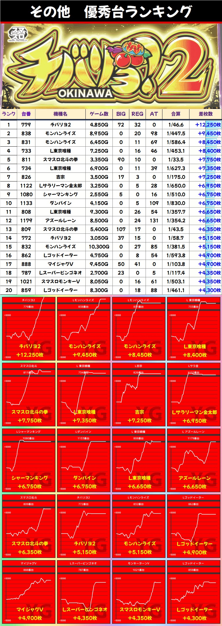 また、SANKYO系のピックアップ台以外でトップ差枚に輝いたのは最新台の【チバリヨ2・779番台】の+12250枚!!続く2位には【モンハンライズ・838番台】の+9450枚、3位は【モンハンライズ・831番台】の+8450枚という結果に!TOP20は全て+4000枚以上と、相変わらずの良質な優秀台を確認できました!
