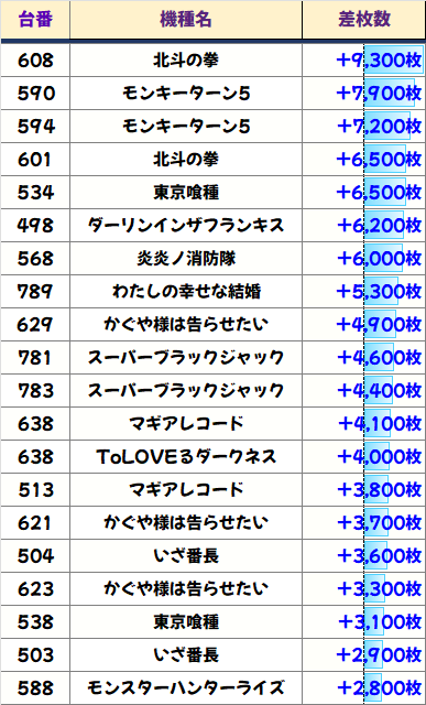 一方、それ以外の機種差枚ランキングでトップに輝いたのは【北斗の拳・608番台】で+9300枚!! 以下、モンキーターン・東京喰種と、人気スマスロ機種から大量獲得台が多数確認できました!